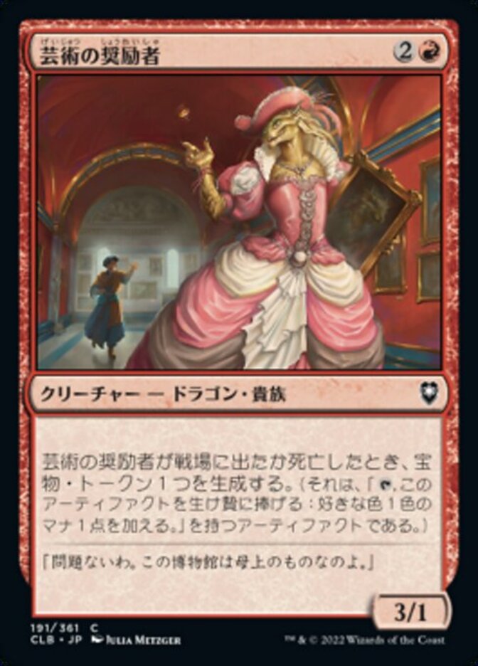 | Rules | When Patron of the Arts enters the battlefield or dies, create a Treasure token. (It's an artifact with ", Sacrifice this artifact: Add one mana of any color.") |