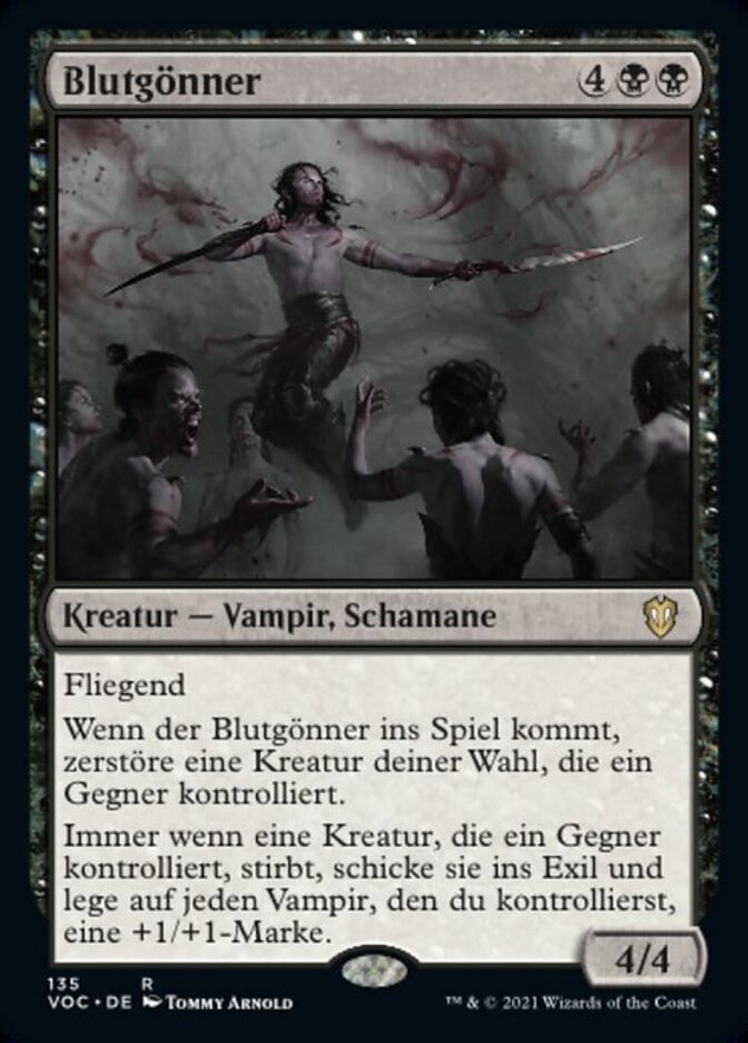 | Rules | Flying When Patron of the Vein enters the battlefield, destroy target creature an opponent controls. Whenever a creature an opponent controls dies, exile it and put a +1/+1 counter on each Vampire you control. |