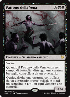 | Rules | Flying When Patron of the Vein enters the battlefield, destroy target creature an opponent controls. Whenever a creature an opponent controls dies, exile it and put a +1/+1 counter on each Vampire you control. |