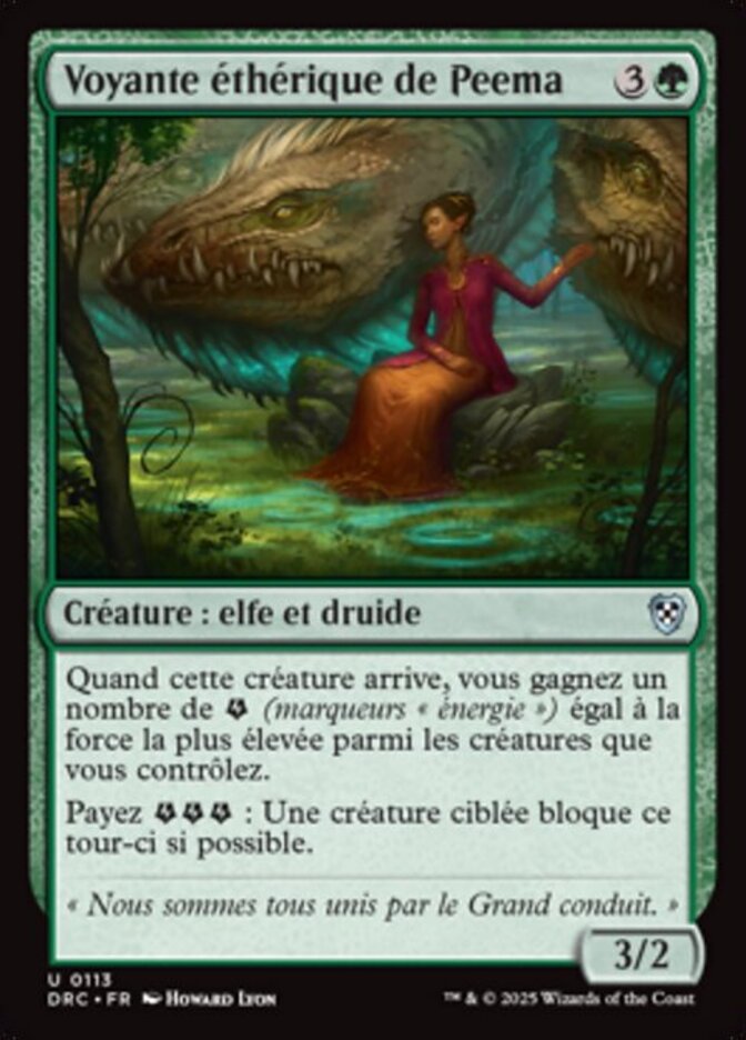 | Rules | When Peema Aether-Seer enters the battlefield, you get an amount of (energy counters) equal to the greatest power among creatures you control. Pay : Target creature blocks this turn if able. |