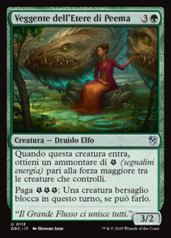 | Rules | When Peema Aether-Seer enters the battlefield, you get an amount of (energy counters) equal to the greatest power among creatures you control. Pay : Target creature blocks this turn if able. |