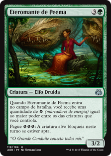 | Rules | When Peema Aether-Seer enters the battlefield, you get an amount of (energy counters) equal to the greatest power among creatures you control. Pay : Target creature blocks this turn if able. |