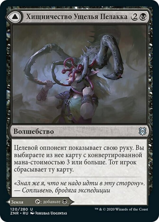 | Rules | Target opponent reveals their hand. You choose a card from it with mana value 3 or greater. That player discards that card. // Pelakka Caverns enters the battlefield tapped. : Add . |
