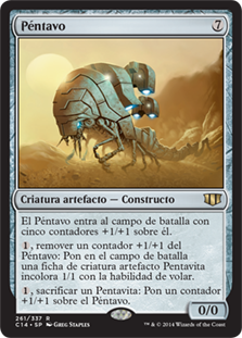 | Rules | Pentavus enters the battlefield with five +1/+1 counters on it. , Remove a +1/+1 counter from Pentavus: Create a 1/1 colorless Pentavite artifact creature token with flying. , Sacrifice a Pentavite: Put a +1/+1 counter on Pentavus. |