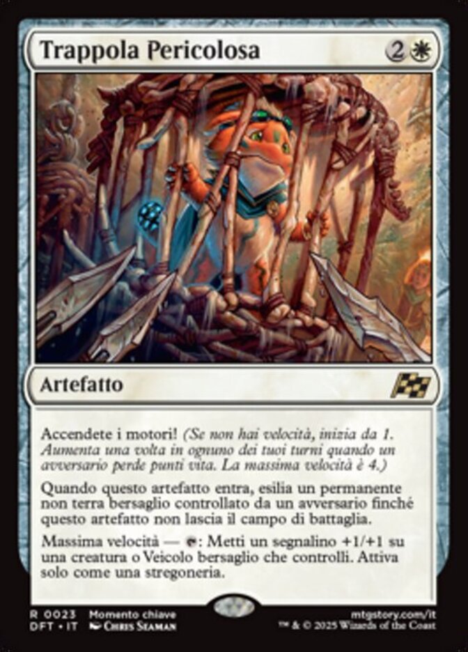 | Rules | Start your engines! (If you have no speed, it starts at 1. It increases once on each of your turns when an opponent loses life. Max speed is 4.) When this artifact enters, exile target nonland permanent an opponent controls until this artifact leaves the battlefield. Max speed — : Put a +1/+1 counter on target creature or Vehicle you control. Activate only as a sorcery. |