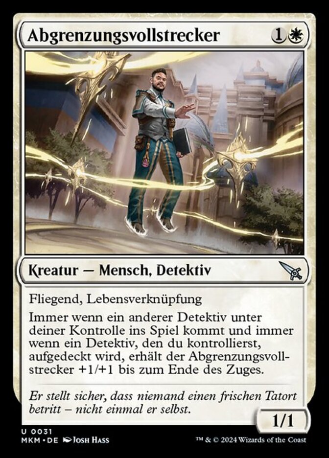 | Rules | Flying, lifelink Whenever another Detective enters the battlefield under your control and whenever a Detective you control is turned face up, Perimeter Enforcer gets +1/+1 until end of turn. |