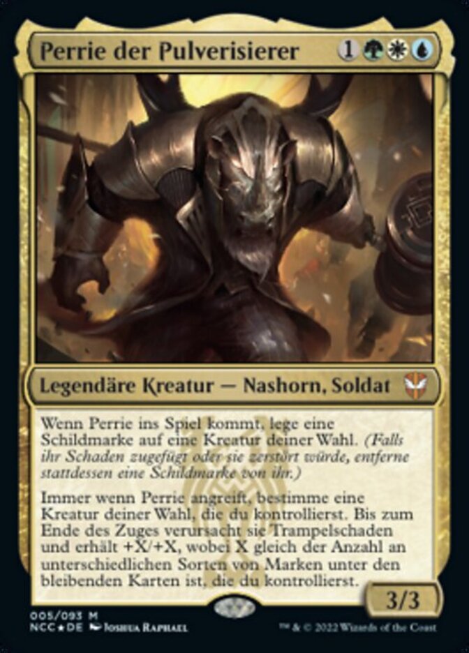 | Rules | When Perrie enters the battlefield, put a shield counter on target creature. (If it would be dealt damage or destroyed, remove a shield counter from it instead.) Whenever Perrie attacks, target creature you control gains trample and gets +X/+X, where X is the number of different kinds of counters among permanents you control. |