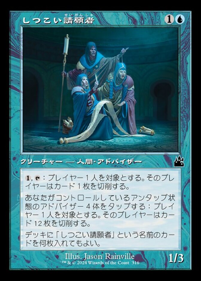| Rules | , : Target player mills a card. Tap four untapped Advisors you control: Target player mills twelve cards. A deck can have any number of cards named Persistent Petitioners. |