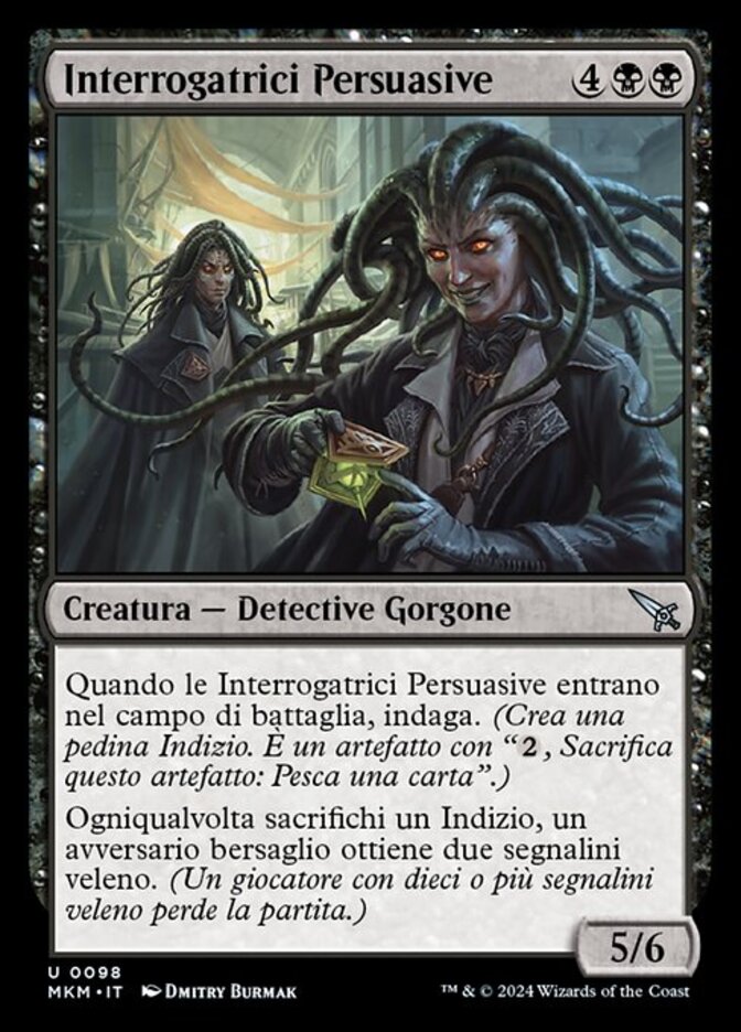 | Rules | When Persuasive Interrogators enters the battlefield, investigate. (Create a Clue token. It's an artifact with ", Sacrifice this artifact: Draw a card.") Whenever you sacrifice a Clue, target opponent gets two poison counters. (A player with ten or more poison counters loses the game.) |
