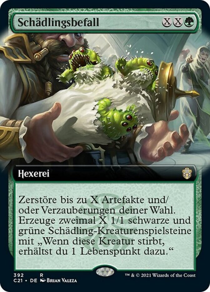 | Rules | Destroy up to X target artifacts and/or enchantments. Create twice X 1/1 black and green Pest creature tokens with "When this creature dies, you gain 1 life." |