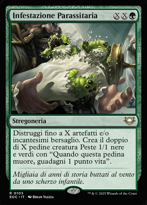 | Rules | Destroy up to X target artifacts and/or enchantments. Create twice X 1/1 black and green Pest creature tokens with "When this creature dies, you gain 1 life." |