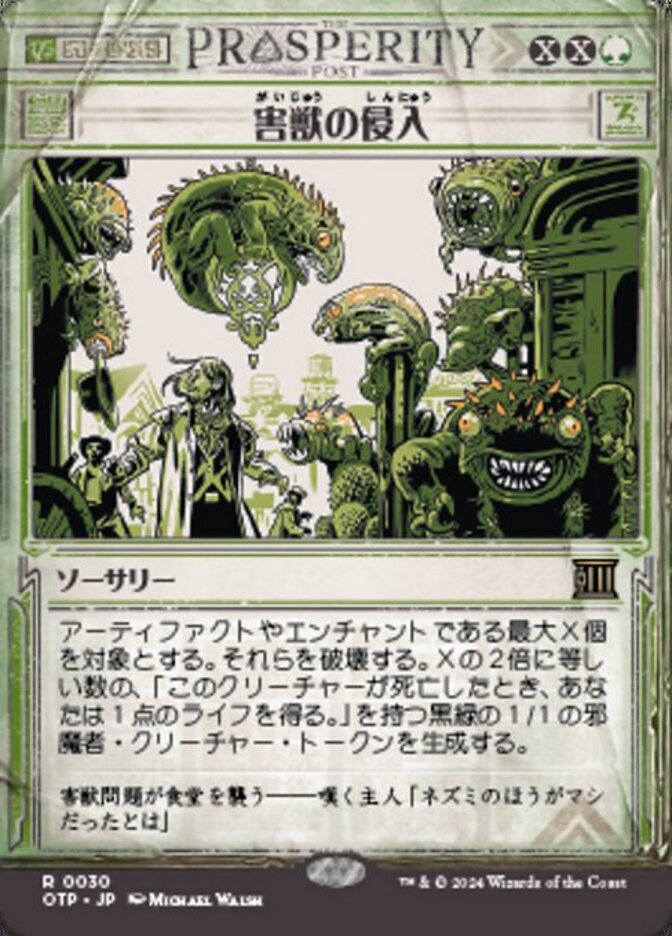 | Rules | Destroy up to X target artifacts and/or enchantments. Create twice X 1/1 black and green Pest creature tokens with "When this creature dies, you gain 1 life." |