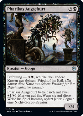 | Rules | Escape—, Exile three other cards from your graveyard. (You may cast this card from your graveyard for its escape cost.) Pharika's Spawn escapes with two +1/+1 counters on it. When it enters the battlefield this way, each opponent sacrifices a non-Gorgon creature. |