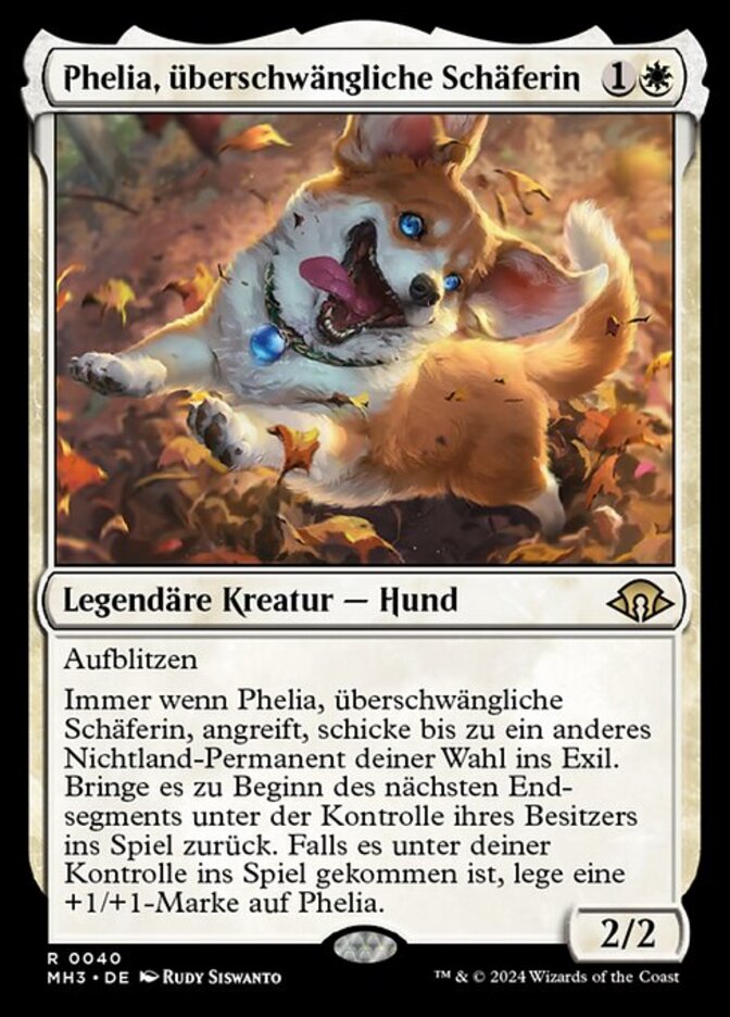 | Rules | Flash Whenever Phelia, Exuberant Shepherd attacks, exile up to one other target nonland permanent. At the beginning of the next end step, return that card to the battlefield under its owner's control. If it entered under your control, put a +1/+1 counter on Phelia. |