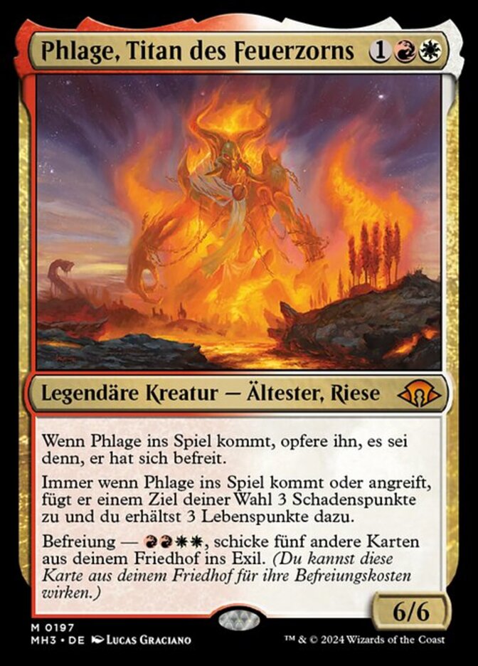 | Rules | When Phlage enters the battlefield, sacrifice it unless it escaped. Whenever Phlage enters the battlefield or attacks, it deals 3 damage to any target and you gain 3 life. Escape—, Exile five other cards from your graveyard. (You may cast this card from your graveyard for its escape cost.) |