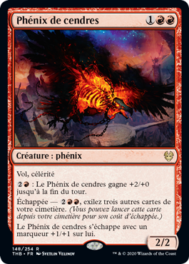 | Rules | Flying, haste : Phoenix of Ash gets +2/+0 until end of turn. Escape—, Exile three other cards from your graveyard. (You may cast this card from your graveyard for its escape cost.) Phoenix of Ash escapes with a +1/+1 counter on it. |