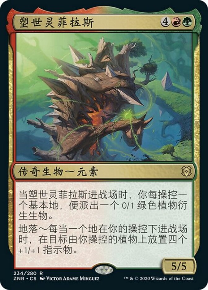 | Rules | When Phylath, World Sculptor enters the battlefield, create a 0/1 green Plant creature token for each basic land you control. Landfall — Whenever a land enters the battlefield under your control, put four +1/+1 counters on target Plant you control. |