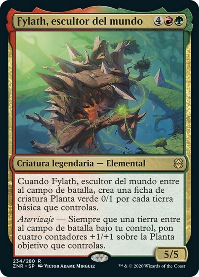 | Rules | When Phylath, World Sculptor enters the battlefield, create a 0/1 green Plant creature token for each basic land you control. Landfall — Whenever a land enters the battlefield under your control, put four +1/+1 counters on target Plant you control. |