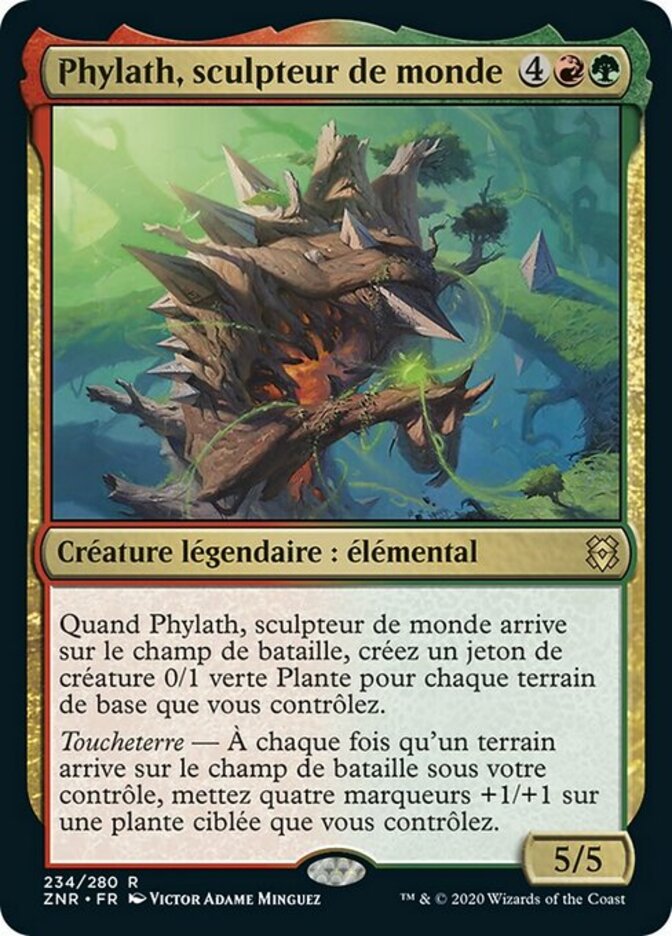| Rules | When Phylath, World Sculptor enters the battlefield, create a 0/1 green Plant creature token for each basic land you control. Landfall — Whenever a land enters the battlefield under your control, put four +1/+1 counters on target Plant you control. |
