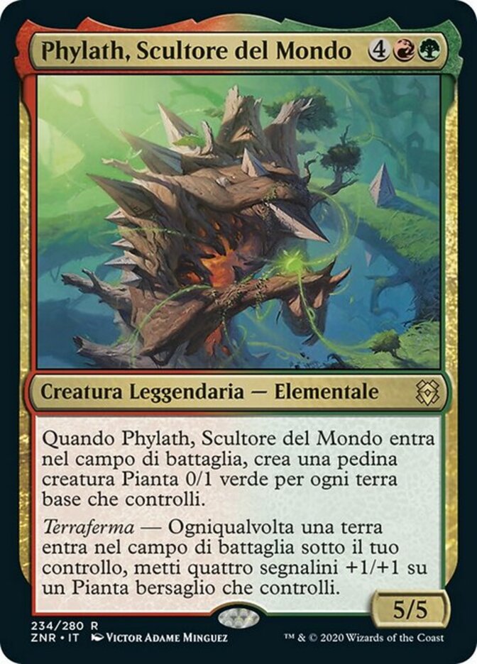 | Rules | When Phylath, World Sculptor enters the battlefield, create a 0/1 green Plant creature token for each basic land you control. Landfall — Whenever a land enters the battlefield under your control, put four +1/+1 counters on target Plant you control. |