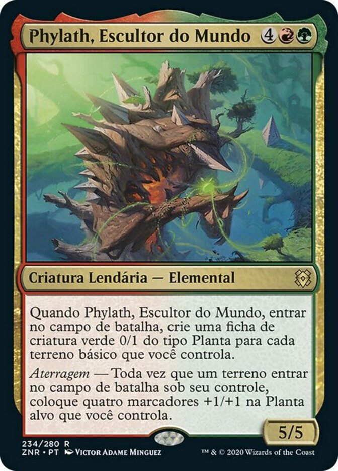| Rules | When Phylath, World Sculptor enters the battlefield, create a 0/1 green Plant creature token for each basic land you control. Landfall — Whenever a land enters the battlefield under your control, put four +1/+1 counters on target Plant you control. |