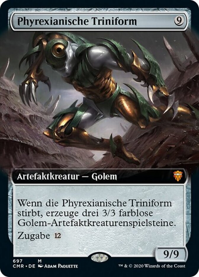 | Rules | When Phyrexian Triniform dies, create three 3/3 colorless Phyrexian Golem artifact creature tokens. Encore (, Exile this card from your graveyard: For each opponent, create a token copy that attacks that opponent this turn if able. They gain haste. Sacrifice them at the beginning of the next end step. Activate only as a sorcery.) |