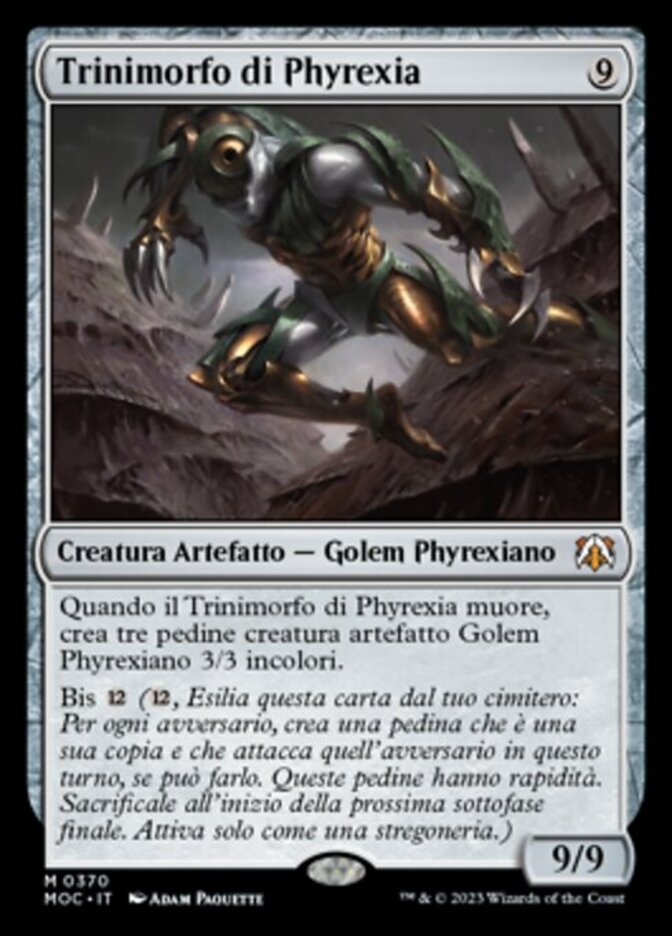 | Rules | When Phyrexian Triniform dies, create three 3/3 colorless Phyrexian Golem artifact creature tokens. Encore (, Exile this card from your graveyard: For each opponent, create a token copy that attacks that opponent this turn if able. They gain haste. Sacrifice them at the beginning of the next end step. Activate only as a sorcery.) |