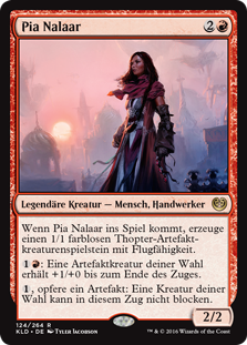 | Rules | When Pia Nalaar enters the battlefield, create a 1/1 colorless Thopter artifact creature token with flying. : Target artifact creature gets +1/+0 until end of turn. , Sacrifice an artifact: Target creature can't block this turn. |