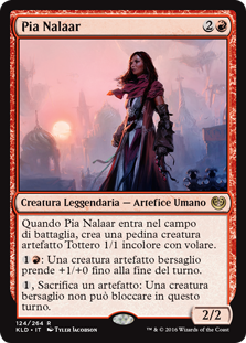 | Rules | When Pia Nalaar enters the battlefield, create a 1/1 colorless Thopter artifact creature token with flying. : Target artifact creature gets +1/+0 until end of turn. , Sacrifice an artifact: Target creature can't block this turn. |