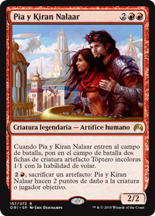 | Rules | When Pia and Kiran Nalaar enters the battlefield, create two 1/1 colorless Thopter artifact creature tokens with flying. , Sacrifice an artifact: Pia and Kiran Nalaar deals 2 damage to any target. |
