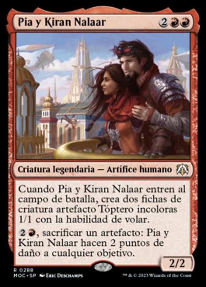 | Rules | When Pia and Kiran Nalaar enters the battlefield, create two 1/1 colorless Thopter artifact creature tokens with flying. , Sacrifice an artifact: Pia and Kiran Nalaar deals 2 damage to any target. |