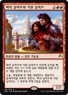 | Rules | When Pia and Kiran Nalaar enters the battlefield, create two 1/1 colorless Thopter artifact creature tokens with flying. , Sacrifice an artifact: Pia and Kiran Nalaar deals 2 damage to any target. |