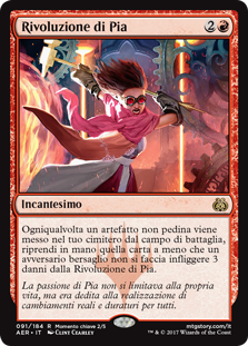 | Rules | Whenever a nontoken artifact is put into your graveyard from the battlefield, return that card to your hand unless target opponent has Pia's Revolution deal 3 damage to them. |