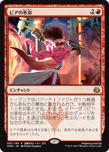 | Rules | Whenever a nontoken artifact is put into your graveyard from the battlefield, return that card to your hand unless target opponent has Pia's Revolution deal 3 damage to them. |