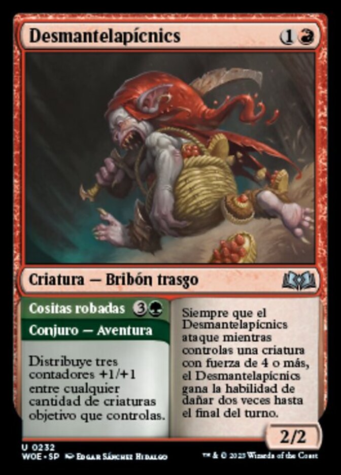 | Rules | Whenever Picnic Ruiner attacks while you control a creature with power 4 or greater, Picnic Ruiner gains double strike until end of turn. // Distribute three +1/+1 counters among any number of target creatures you control. |