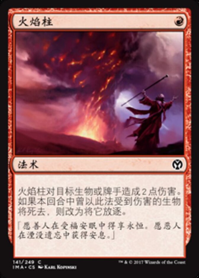 | Rules | Pillar of Flame deals 2 damage to any target. If a creature dealt damage this way would die this turn, exile it instead. |