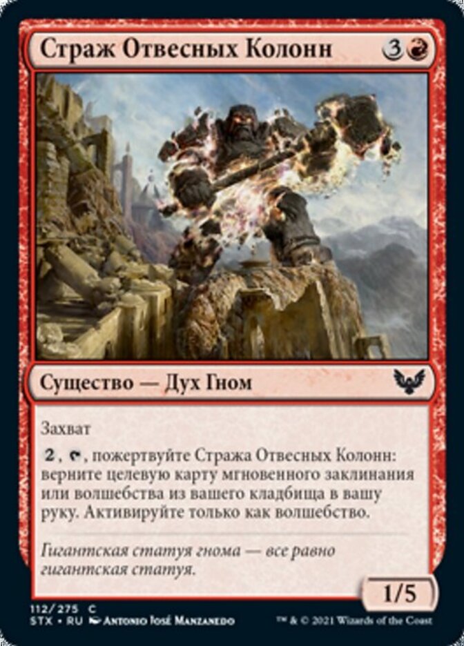 | Rules | Reach , , Sacrifice Pillardrop Warden: Return target instant or sorcery card from your graveyard to your hand. Activate only as a sorcery. |
