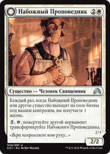 | Rules | Whenever Pious Evangel or another creature enters the battlefield under your control, you gain 1 life. , , Sacrifice another permanent: Transform Pious Evangel. // Whenever Wayward Disciple or another creature you control dies, target opponent loses 1 life and you gain 1 life. |