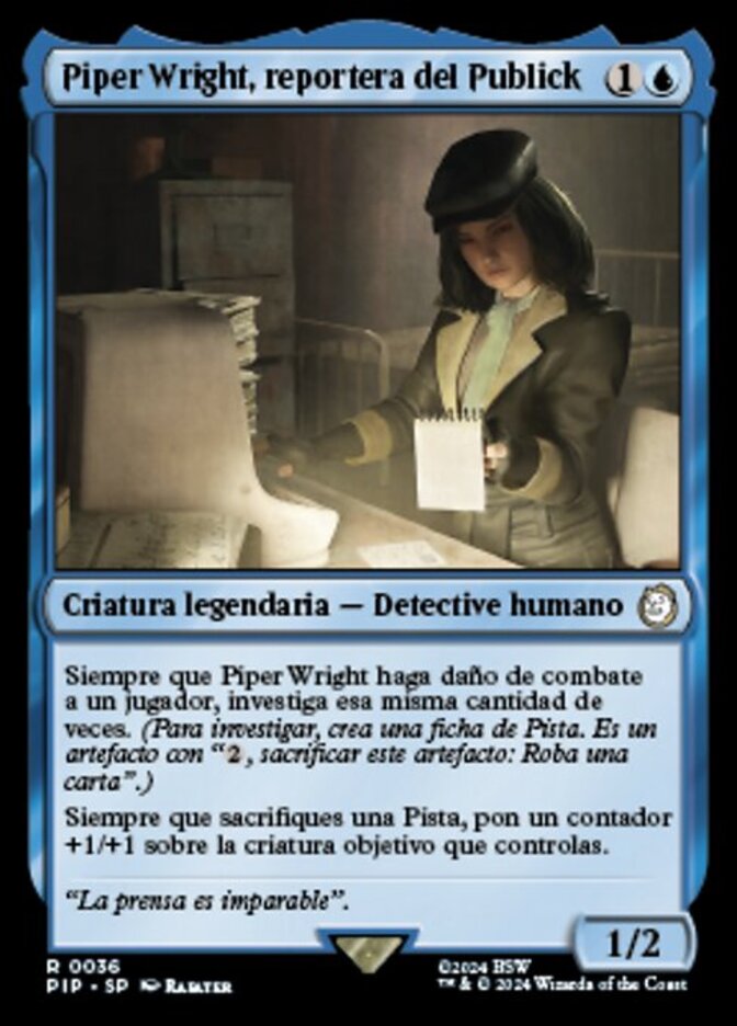 | Rules | Whenever Piper Wright deals combat damage to a player, investigate that many times. (To investigate, create a Clue token. It's an artifact with ", Sacrifice this artifact: Draw a card.") Whenever you sacrifice a Clue, put a +1/+1 counter on target creature you control. |
