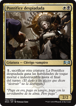 | Rules | , Sacrifice another creature: Pitiless Pontiff gains deathtouch and indestructible until end of turn. (Damage and effects that say "destroy" don't destroy it.) |