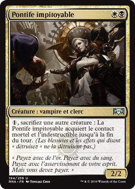 | Rules | , Sacrifice another creature: Pitiless Pontiff gains deathtouch and indestructible until end of turn. (Damage and effects that say "destroy" don't destroy it.) |