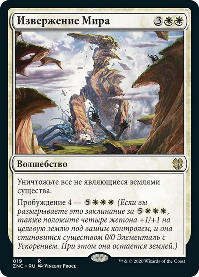 | Rules | Destroy all nonland creatures. Awaken 4— (If you cast this spell for , also put four +1/+1 counters on target land you control and it becomes a 0/0 Elemental creature with haste. It's still a land.) |