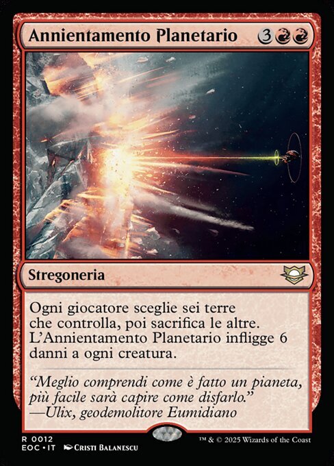 | Rules | Each player chooses six lands they control, then sacrifices the rest. Planetary Annihilation deals 6 damage to each creature. |