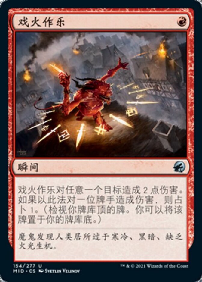 | Rules | Play with Fire deals 2 damage to any target. If a player is dealt damage this way, scry 1. (Look at the top card of your library. You may put that card on the bottom of your library.) |