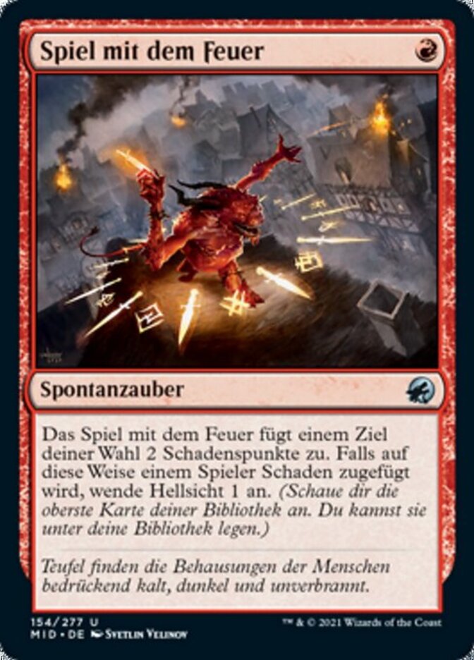 | Rules | Play with Fire deals 2 damage to any target. If a player is dealt damage this way, scry 1. (Look at the top card of your library. You may put that card on the bottom of your library.) |