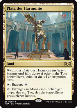 | Rules | When Plaza of Harmony enters the battlefield, if you control two or more Gates, you gain 3 life. : Add . : Add one mana of any type that a Gate you control could produce. |