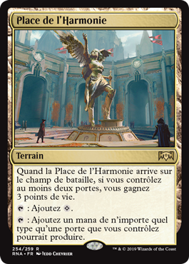 | Rules | When Plaza of Harmony enters the battlefield, if you control two or more Gates, you gain 3 life. : Add . : Add one mana of any type that a Gate you control could produce. |
