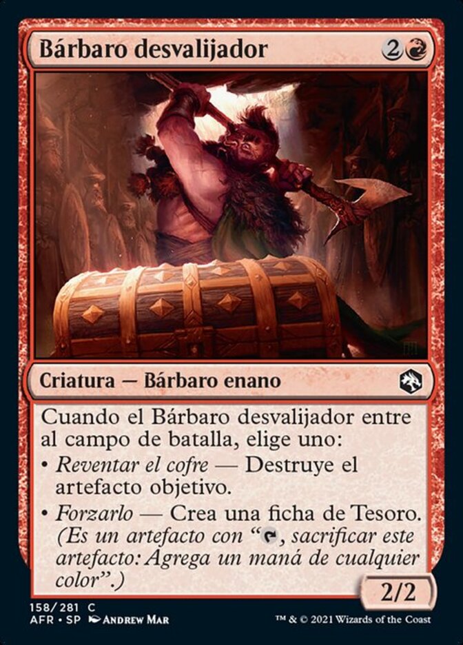 | Rules | When Plundering Barbarian enters the battlefield, choose one — • Smash the Chest — Destroy target artifact. • Pry It Open — Create a Treasure token. (It's an artifact with ", Sacrifice this artifact: Add one mana of any color.") |