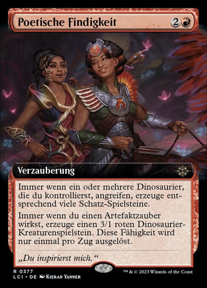 | Rules | Whenever one or more Dinosaurs you control attack, create that many Treasure tokens. Whenever you cast an artifact spell, create a 3/1 red Dinosaur creature token. This ability triggers only once each turn. |