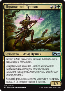| Rules | Reach (This creature can block creatures with flying.) Deathtouch (Any amount of damage this deals to a creature is enough to destroy it.) Whenever another creature dies, each opponent loses 1 life. |